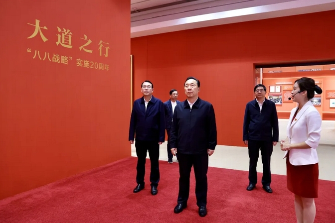 浙江展覽館內,大道之行——“八八戰略”實施20週年大型主題展覽已成為理論宣講、學習實踐、紅色教育的重要平台。展覽分為偉大擘畫、精彩蝶變、勇立潮頭、共譜華章等四個篇章,生動展示習近平新時代中國特色社會主義思想在浙江的實踐探索歷程,立體呈現在“八八戰略”指引下浙江全領域各方面發生的精彩蝶變。當日上午,王浩走進展廳參觀展覽,駐足仔細觀看,認真聽取講解,不時詢問情況。他滿懷深情地説,“八八戰略”是習近平總書記為浙江量身定製的省域發展全面規劃和頂層設計,是引領浙江改革發展的總綱領總方略,是管全局、管長遠、管根本的,具有穿越時空的真理力量和實踐偉力,為我們做好浙江工作留下了取之不盡、用之不竭的寶貴財富。