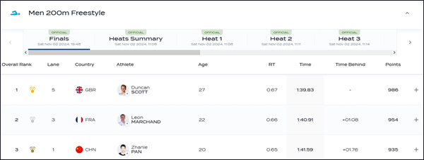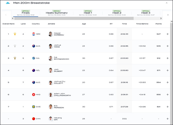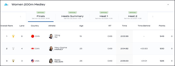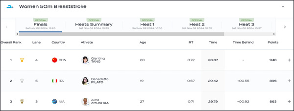 據世界游泳聯合會網站消息,11月2日是2024游泳世界盃新加坡站第三個比賽日。