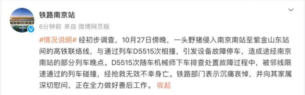 10月27日,南京發生了一起因野豬侵入列車線路而導致的嚴重事故,一頭野豬侵入列車線路,與通過的D5515次列車相撞,引發設備故障停車,D5515次隨車機械師下車排查處置故障過程中,被鄰線限速通過的列車碰撞,經搶救無效不幸身亡。