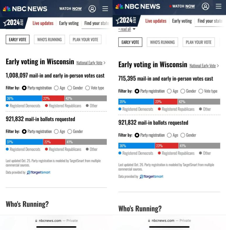 美國國家廣播公司(NBC)統計的威斯康星州的郵寄選票,10月25日的郵寄選票是10萬多票(左),26日變成了7萬多票,難不成威斯康星州把郵寄選票寄回去了?