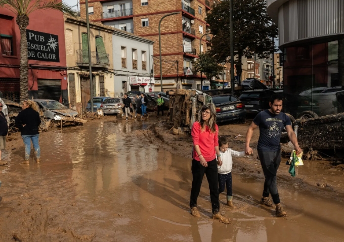 11月1日,人們在西班牙巴倫西亞阿爾法法爾市的泥濘道路上行走。 《紐約時報》