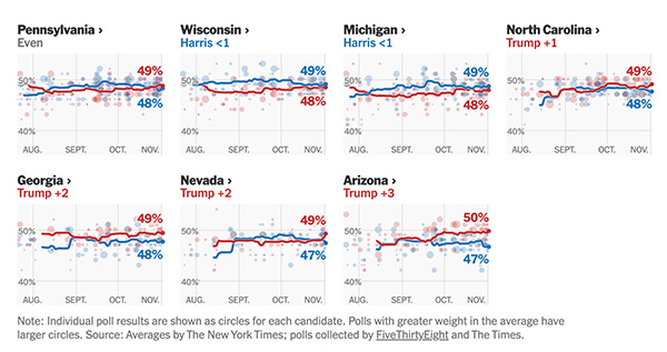 根據美國《紐約時報》11月3日的最新民調,七個搖擺州中,特朗普以微弱的優勢在北卡羅來納州、佐治亞州、內華達州和亞利桑那州領先,另一邊哈里斯在威斯康星州和密歇根州小勝特朗普,而在關鍵州中的關鍵賓夕法尼亞州,二人目前打了個平手。