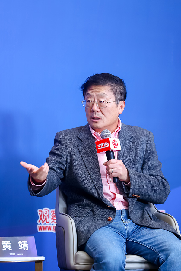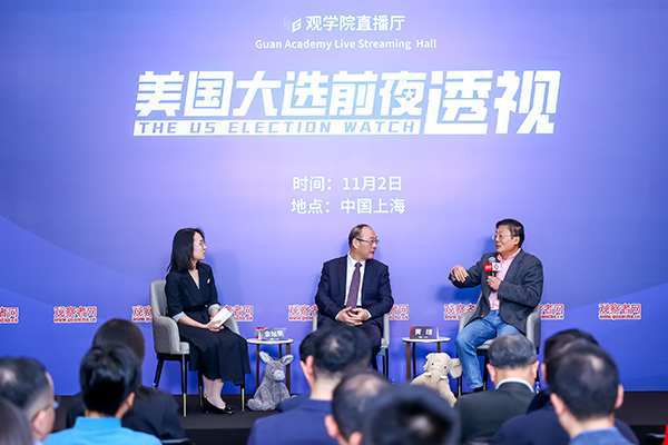 《觀學院直播廳》美國大選前夜透視,從左至右依次為主持人冬曉、中國人民大學吳玉章講席教授金燦榮、上海外國語大學傑出教授黃靖。