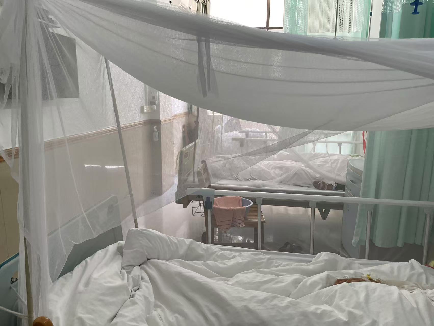 如10月24日,第一財經記者走訪了佛山復星禪誠醫院感染科病房,該醫院是佛山收治登革熱患者的定點醫院之一。記者在感染科病房中看到,收治登革熱患者的牀位都掛了蚊帳。不僅如此,病房門口也掛着簾子,目的是為了防範蚊子。