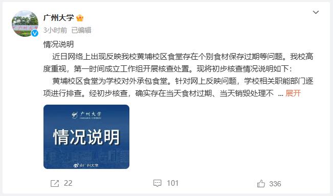廣州大學黃埔校區學生食堂近日被曝出存在食品安全問題。對此,@廣州大學 11月3日發佈情況説明。