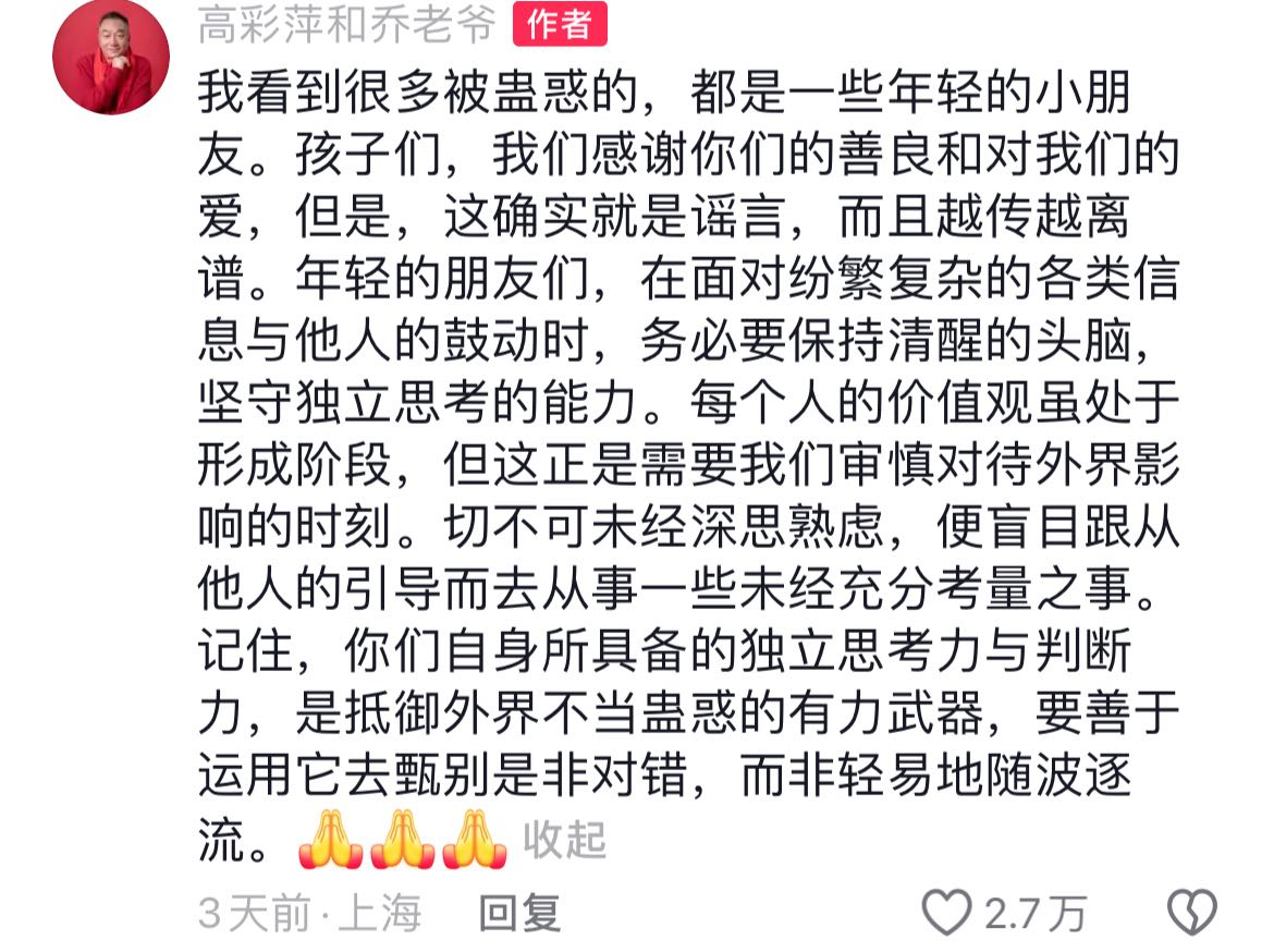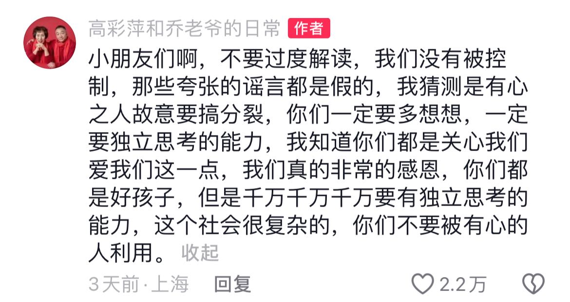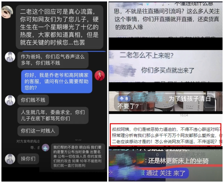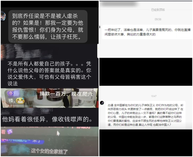 不過,仍有部分網絡用户不信喬任梁父母的回應,稱他們“不敢説出‘真相’”,甚至有用户私信謾罵,斥責兩位老人“委曲求全”“收錢噤聲”“懦弱”,一切都是為了“往直播間引流”。