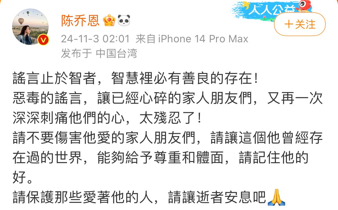 11月3日凌晨2時左右,喬任梁生前摯友、中國台灣演員陳喬恩發文,痛斥惡毒的謠言再次刺痛了喬任梁的家人和朋友,期盼謠言止於智者。“請不要傷害他愛的家人朋友們,請讓這個他曾經存在過的世界,能夠給予尊重和體面,請記住他的好。請保護那些愛着他的人,請讓逝者安息吧。”
