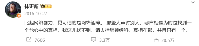 在喬任梁去世一個多月後,林更新在微博發文回懟謠言:“比起網絡暴力,更可怕的是網絡智障。 那些人聲討別人、惡言相逼為的是找到一個他心中的真相。”