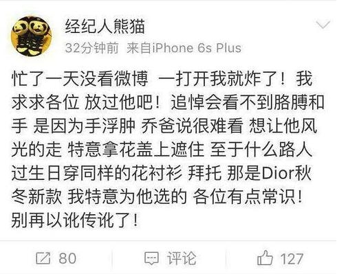 早在2016年,喬任梁經紀人就曾發文闢謠,對“遺體不完整”“撞衫”等傳聞作出回應,稱“追悼會看不到(喬任梁)胳膊是因為手浮腫……特意拿花蓋上遮住”。至於喬任梁遺體所穿服飾與他人相同,經紀人解釋稱,那是他為喬任梁選的某品牌秋冬新款,並呼籲別再以訛傳訛。