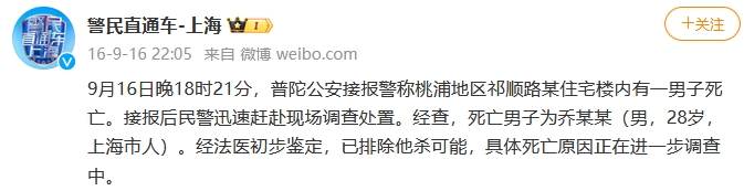 2016年9月16日晚,“警民直通車—上海”官微發文稱:9月16日晚18時21分,普陀公安接報警稱桃浦地區祁順路某住宅樓內有一男子死亡。接報後民警迅速趕赴現場調查處置。經查,死亡男子為喬某某(男,28歲,上海市人)。經法醫初步鑑定,已排除他殺可能,具體死亡原因正在進一步調查中。