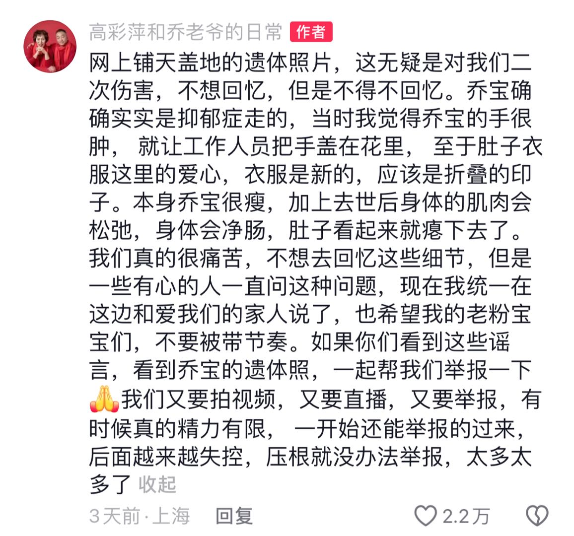 10月31日,喬任梁父母在抖音評論區發文稱:“喬寶確確實實是抑鬱症走的,當時我覺得喬寶的手很腫, 就讓工作人員把手蓋在花裏, 至於肚子衣服這裏的愛心,衣服是新的,應該是摺疊的印子。本身喬寶很瘦,加上去世後身體的肌肉會鬆弛,身體會淨腸,肚子看起來就癟下去了。”