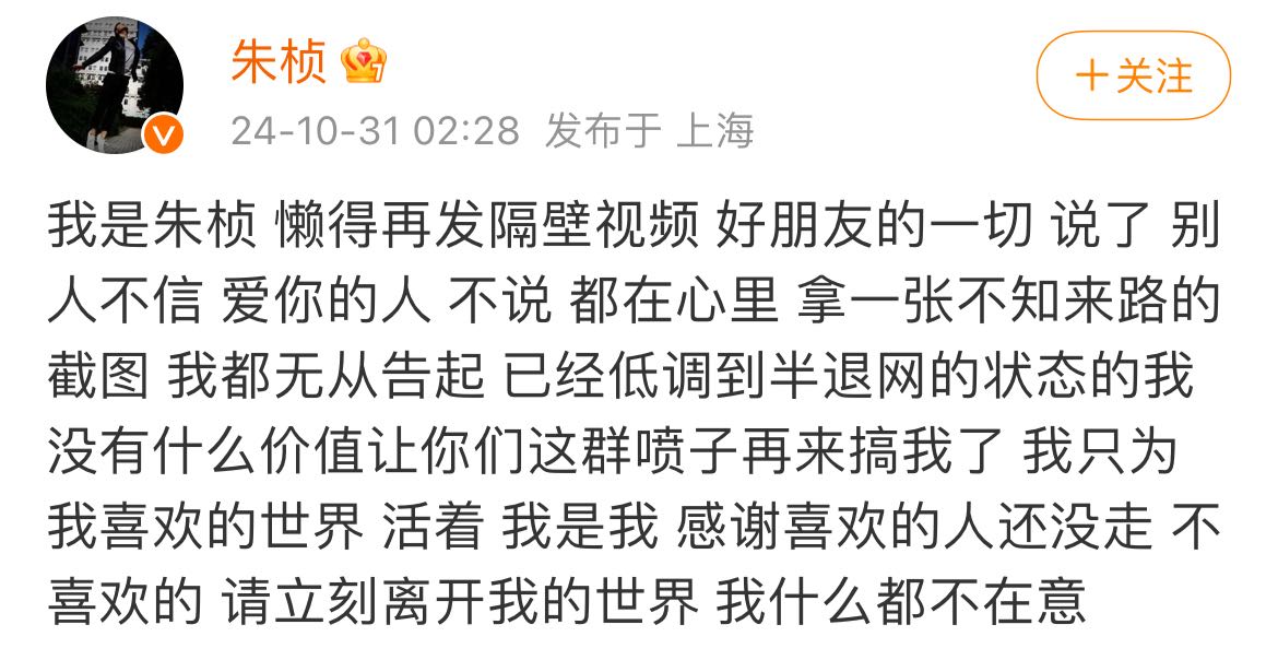 對此,朱楨10月31日凌晨2時28分在微博發文否認傳聞,稱對着一張不知來路的截圖,他都無從告起,“好朋友的一切,説了,別人不信,愛你的人,不説,都在心裏……已經低調到半退網的狀態的我,沒有什麼價值讓你們這羣噴子再來搞我了……”