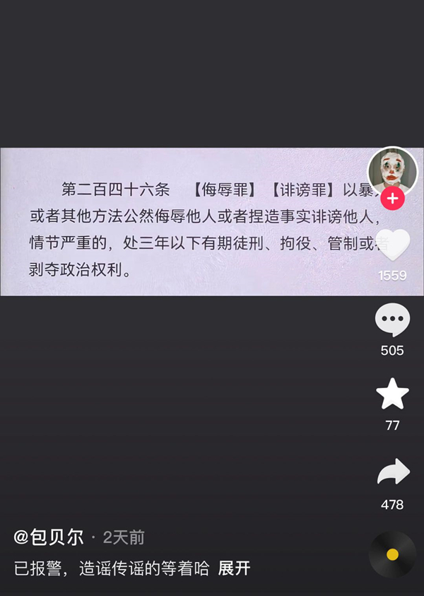演員包貝爾也於10月31日晚在抖音發文稱:“已報警,造謠傳謠的等着哈。”