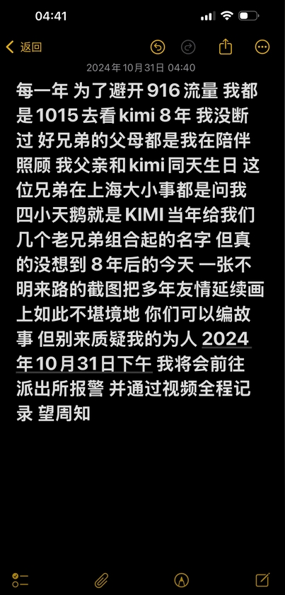 10月31日凌晨4時41分,朱楨又在抖音發文稱“可以編故事,但別來質疑我的為人”,並稱將於10月31日下午報警。