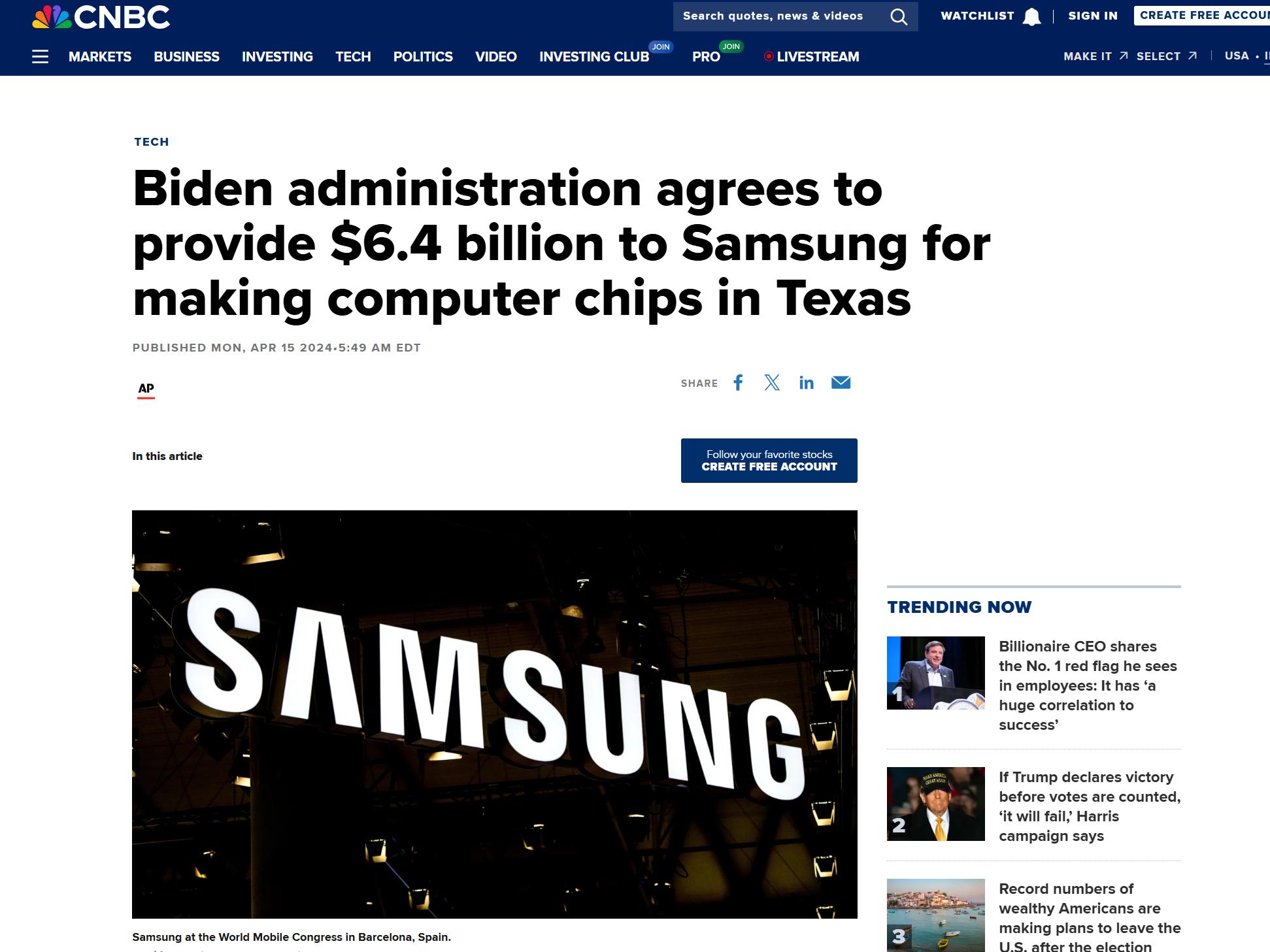 三星作為拜登政府政策的得益者,現在就有“跟車太貼”的憂慮。2021年11月,三星曾經高調宣佈,在得克薩斯州泰勒投資170億美元,建立一座先進晶圓工廠,這一工廠得到了拜登政府64億美元的注資承諾,本計劃2024年年底投產,但目前已經推遲至2026年“具備運行能力”。