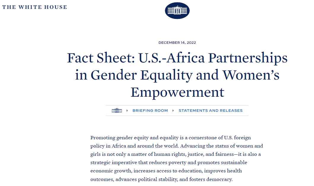 2022年美非峯會,拜登-哈里斯政府發佈了《美國與非洲在性別平等和女性賦權方面的夥伴關係》情況説明書