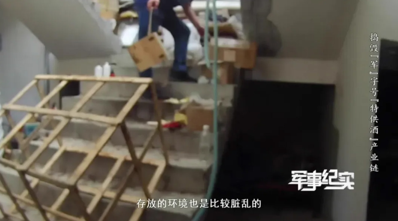 在抓捕現場的角落裏,堆放着帶“八一”軍徽的酒箱、酒瓶,以及剩下的貼紙包材,白酒存放的環境十分髒亂。