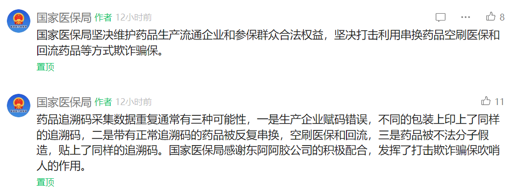 微信公眾號“國家醫保局”11月2日轉載《東阿阿膠關於積極響應國家醫保局有關公告的聲明》,並於3日晚在評論區留言表示,國家醫保局堅決維護藥品生產流通企業和參保羣眾合法權益,堅決打擊利用串換藥品空刷醫保和迴流藥品等方式欺詐騙保。