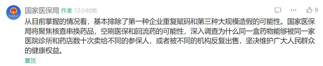 從目前掌握的情況看,基本排除了第一種企業重複賦碼和第三種大規模造假的可能性。國家醫保局將聚焦核查串換藥品,空刷醫保和迴流藥的可能性,深入調查為什麼同一盒藥物能夠被同一家醫院診所和藥店數十次賣給不同的參保人,或者被不同的機構反覆出售,堅決維護廣大人民羣眾的健康權益。