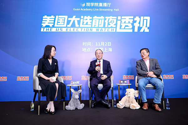 《觀學院直播廳》美國大選前夜透視,從左至右依次為主持人冬曉、中國人民大學吳玉章講席教授金燦榮、上海外國語大學傑出教授黃靖。