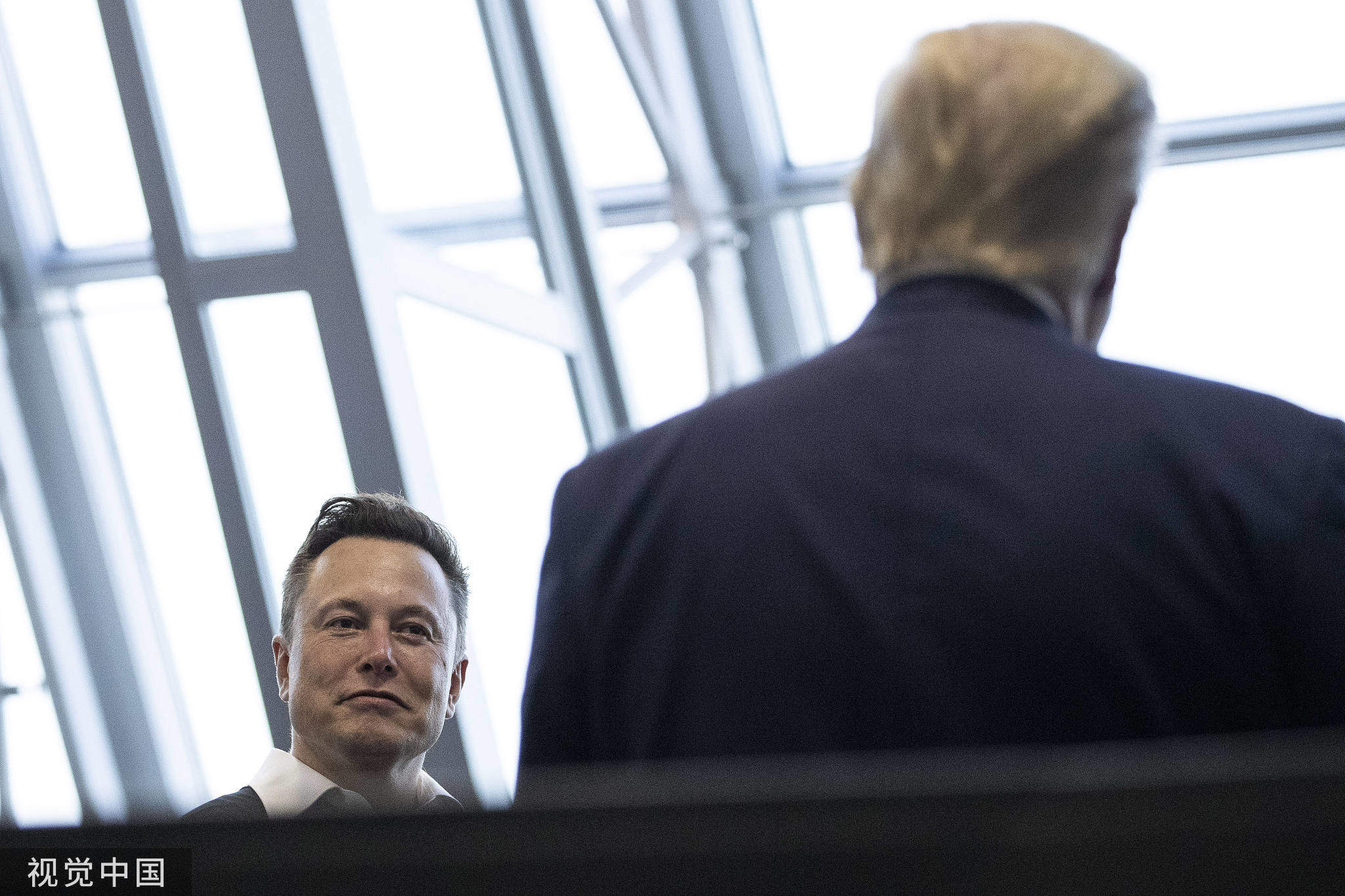 當地時間2020年5月30日,美國肯尼迪航天中心,特斯拉和SpaceX首席執行官馬斯克與時任美國總統特朗普交談。 視覺中國
