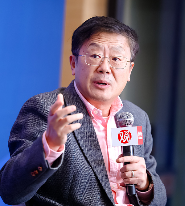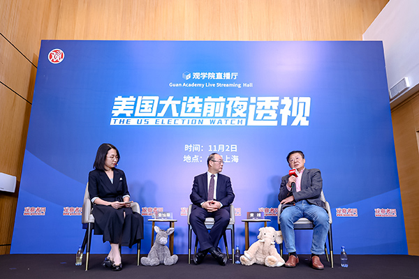 《觀學院直播廳》美國大選前夜透視,從左至右依次為主持人冬曉、中國人民大學吳玉章講席教授金燦榮、上海外國語大學傑出教授黃靖。