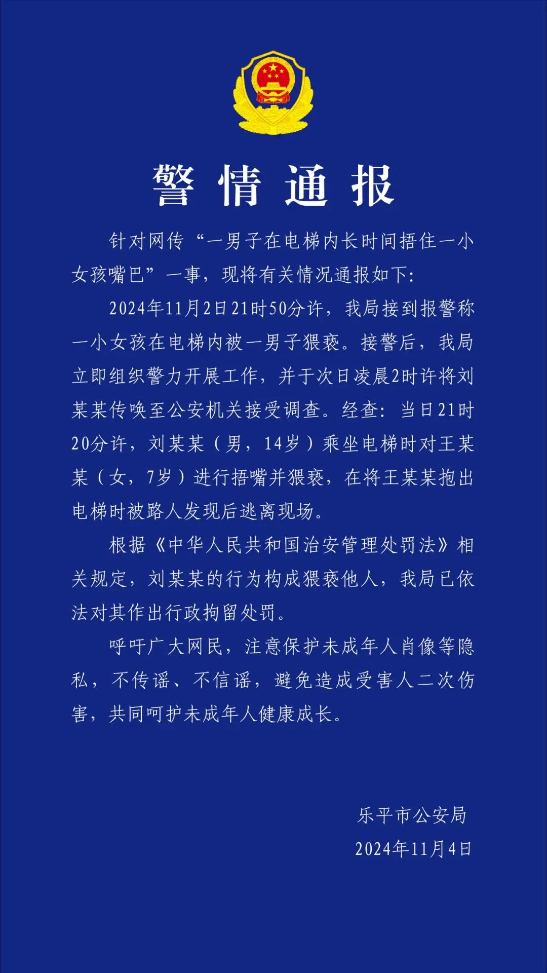 2024年11月2日21時50分許,我局接到報警稱一小女孩在電梯內被一男子猥褻。接警後,我局立即組織警力開展工作,並於次日凌晨2時許將劉某某傳喚至公安機關接受調查。經查:當日21時20分許,劉某某(男,14歲)乘坐電梯時對王某某(女,7歲)進行捂嘴並猥褻,在將王某某抱出電梯時被路人發現後逃離現場。