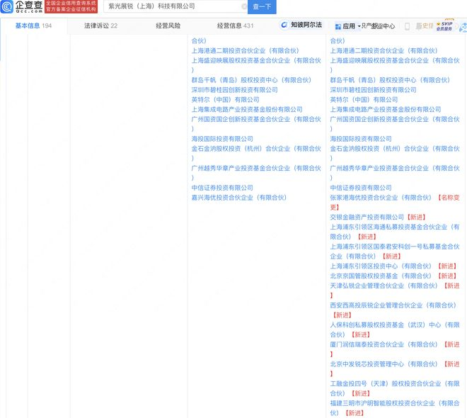 企查查APP顯示,近日,紫光展鋭(上海)科技有限公司發生工商變更,新增工銀資本旗下工融金投四號(天津)股權投資合夥企業(有限合夥)、交銀金融資產投資有限公司、人保資本旗下人保科創私募股權投資基金(武漢)中心(有限合夥)等為股東,同時註冊資本由約50.6億人民幣增至約53.8億人民幣。