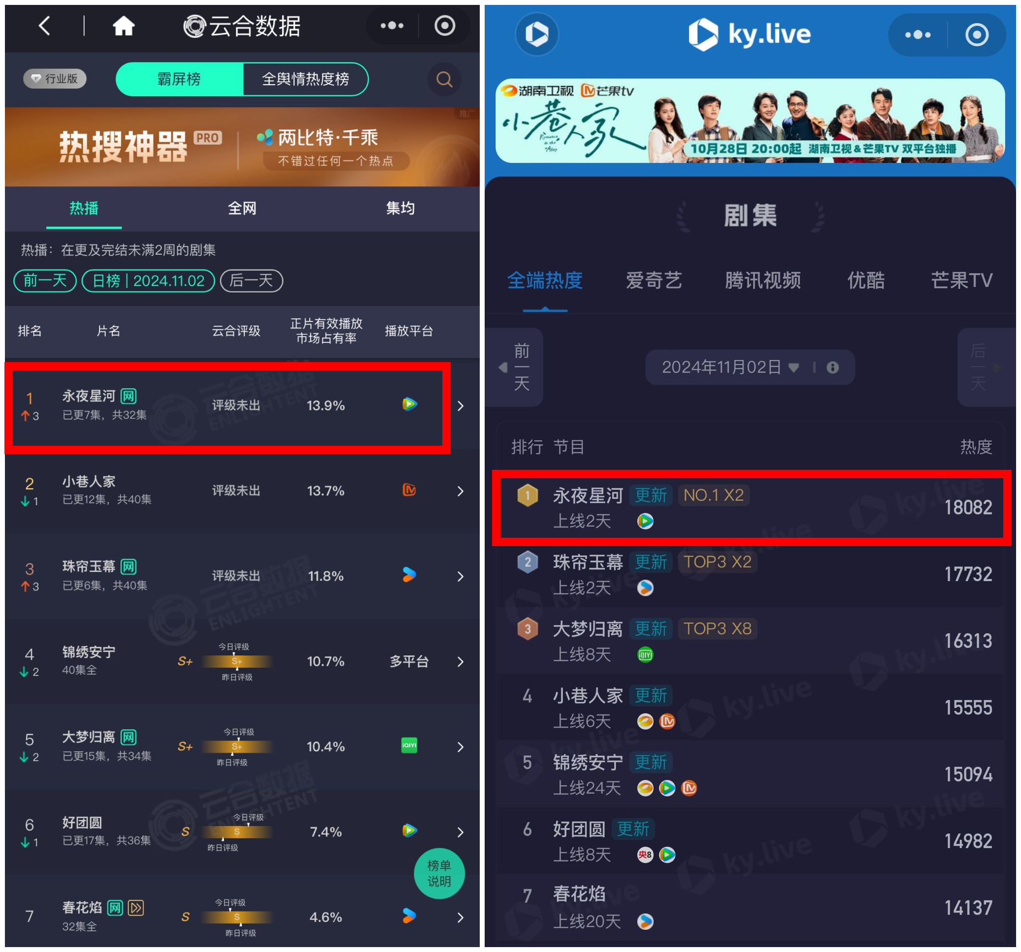雲合有效播放、酷雲熱度榜雙雙登頂,實打實的數據證明,《永夜星河》前八集的播出效果,不是“僅粉圈可見”。