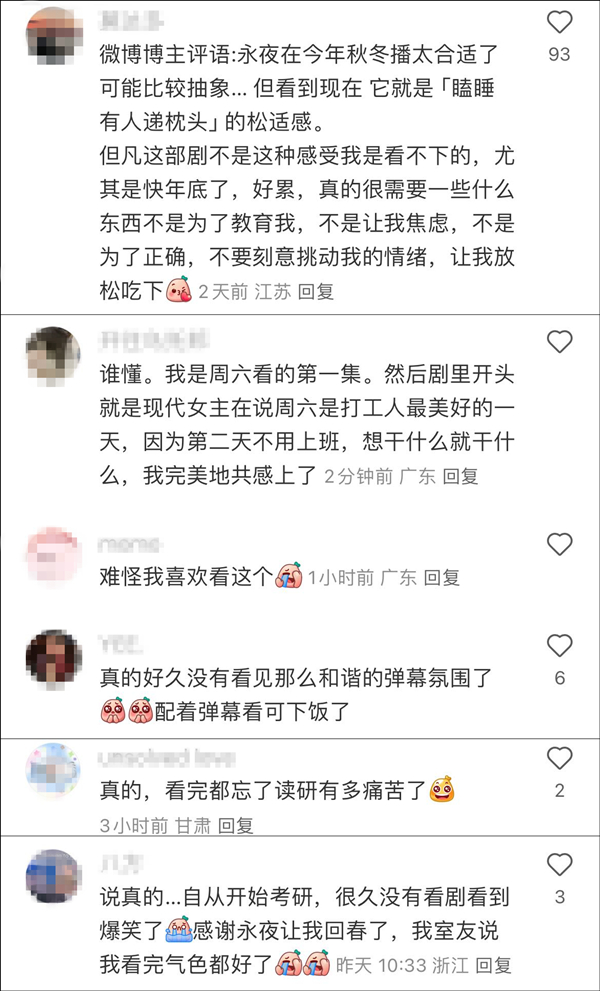 有網友賦予其“祛班味神劇”的稱號,週一在辦公室和教室裏久久回不過神的“牛馬”們,回憶起前一晚追劇的快樂,再次感嘆:“看完後好像忘記了被社會毒打過”“班味都淡了”“輕喜劇就按照這個標準捲起來”……