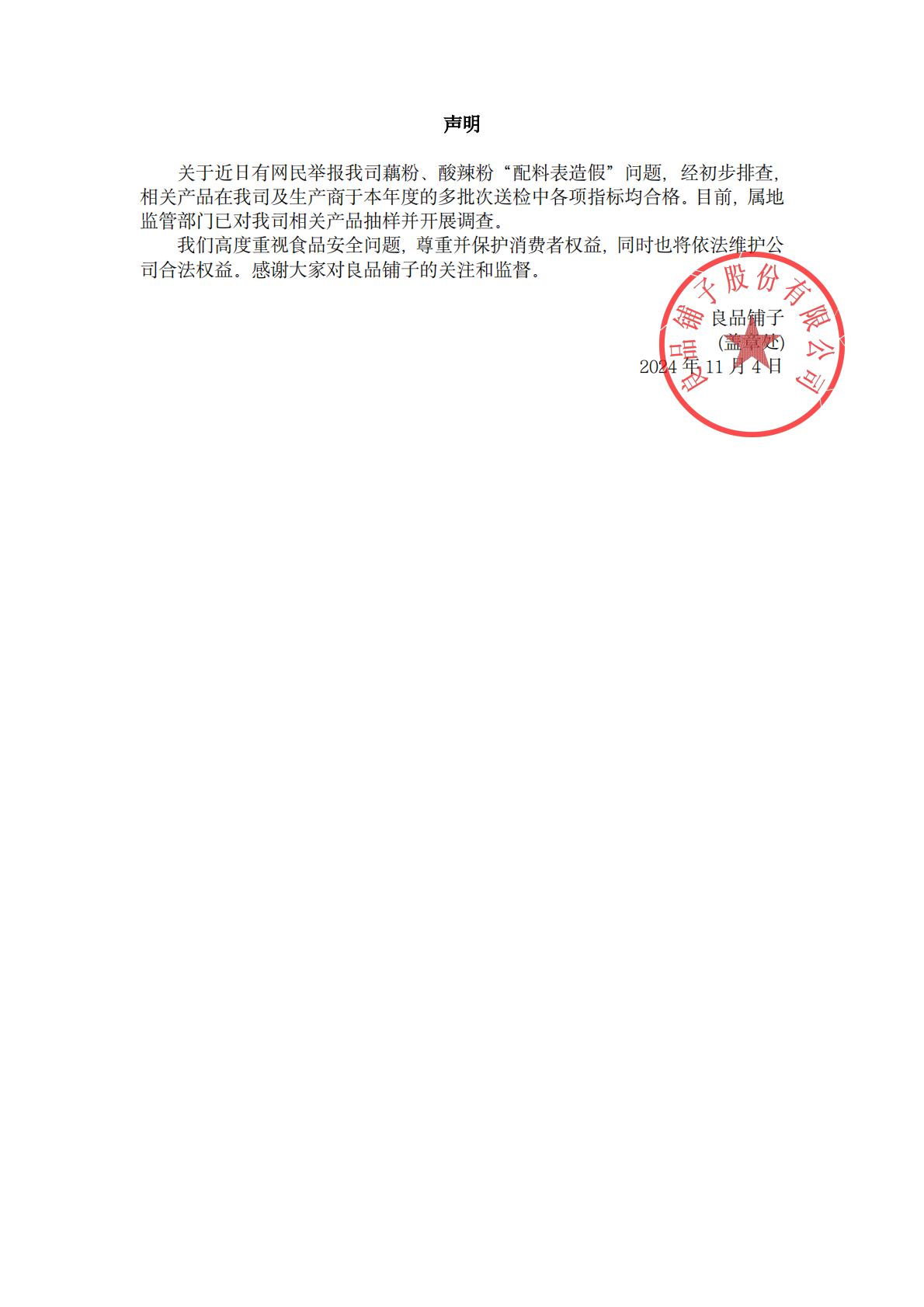 11月4日,良品鋪子發佈聲明稱:關於近日有網民舉報我司藕粉、酸辣粉“配料表造假”問題。經初步排查,相關產品在我司及生產商於本年度的多批次送檢中各項指標均合格。目前,屬地監管部門已對我司相關產品抽樣並開展調查。我們高度重視食品安全問題,尊重並保護消費者權益,同時也將依法維護公司合法權益。