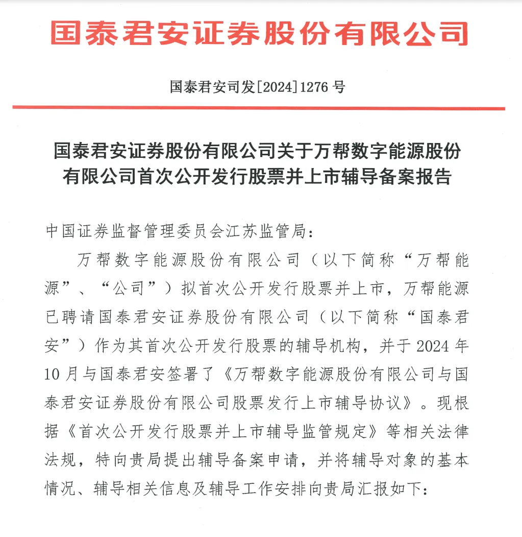 2024年10月31日,證監會官網顯示,充電樁運營商“星星充電”的母公司——萬幫數字能源股份有限公司(以下簡稱“萬幫能源”)的上市輔導備案已獲江蘇證監局受理,輔導機構為國泰君安證券。