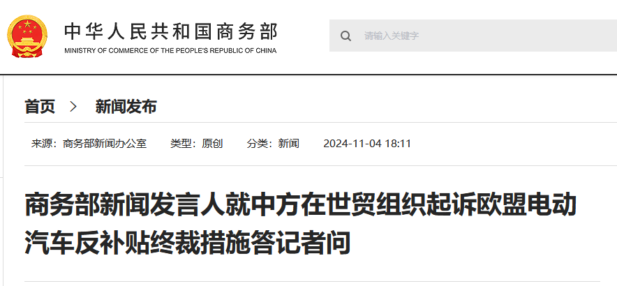 據商務部網站4日消息,商務部新聞發言人就中方在世貿組織起訴歐盟電動汽車反補貼終裁措施答記者問。