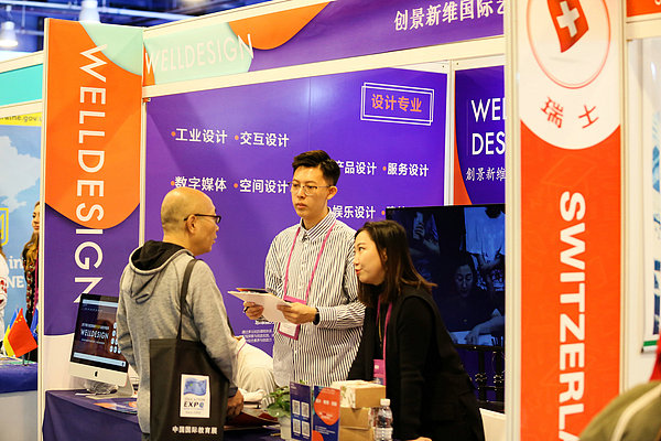 2018年10月20日,北京,2018中國國際教育展上,家長在瑞士出國留學展台諮詢。 視覺中國