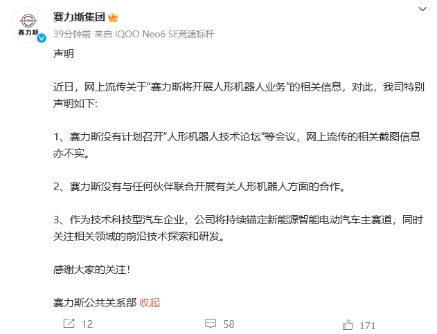 微博@賽力斯集團 4日晚發佈聲明回應進軍人形機器人傳言:沒有與任何夥伴聯合開展有關人形機器人方面的合作。