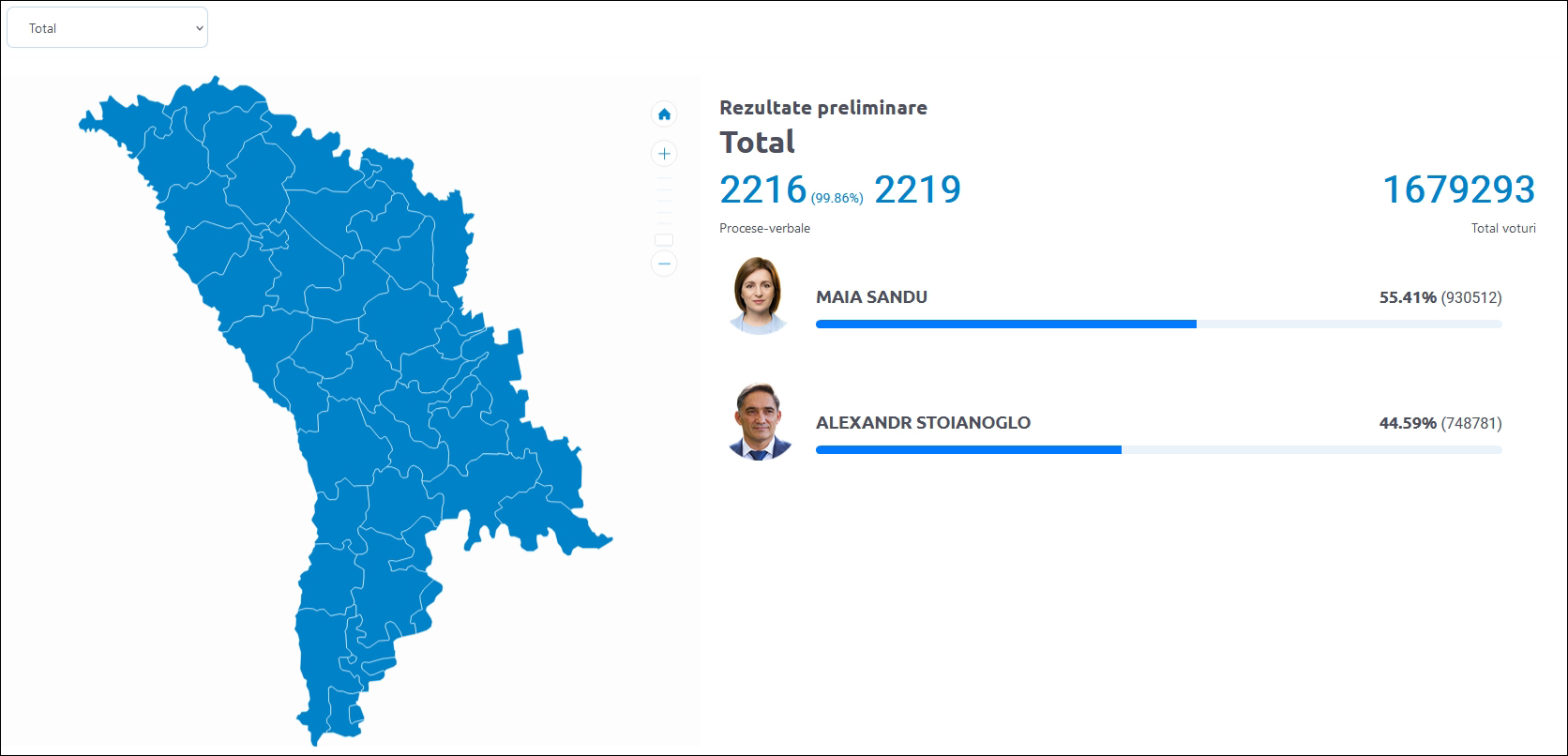 根據摩中央選舉委員會對99.86%選票的初步統計結果,在總計近168萬張選票中,桑杜的得票率為55.41%,前檢察官斯托亞諾格洛的得票率為44.59%。