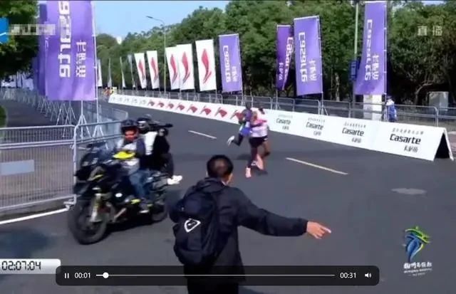 本屆杭州馬拉松終點設置在杭州奧體中心田徑場,出於對運動員安全考慮,組委會對機動車在杭州奧體中心外實行分流措施。考慮到賽事轉播的需要,僅允許轉播摩托車隨運動員繼續前行,在最後分流點對摩托車進行分流。由於轉播摩托車與運動員距離過近,分流卡點裁判員對摩托車進行喊話提醒要求其駛出賽道,因車輛聲音過大,喊話未得到有效回應,裁判員隨即做出手勢指揮摩托車分流,引起緊跟其後的兩名運動員誤判。經其他裁判員及時提醒,運動員重回衝刺賽道。