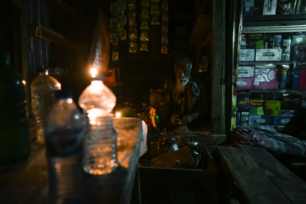 當地時間2023年6月6日,孟加拉國巴里薩爾,停電期間,一名店主坐在黑暗中。由於外匯儲備短缺導致煤炭進口延遲,孟加拉國民眾遭遇頻繁停電。 視覺中國