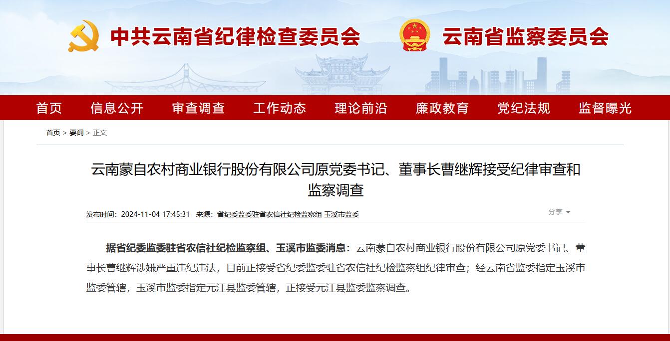 11月4日,雲南省紀委監委官網通報稱,雲南蒙自農村商業銀行股份有限公司原黨委書記、董事長曹繼輝涉嫌嚴重違紀違法,目前正接受省紀委監委駐省農信社紀檢監察組紀律審查;經雲南省監委指定玉溪市監委管轄,玉溪市監委指定元江縣監委管轄,正接受元江縣監委監察調查。