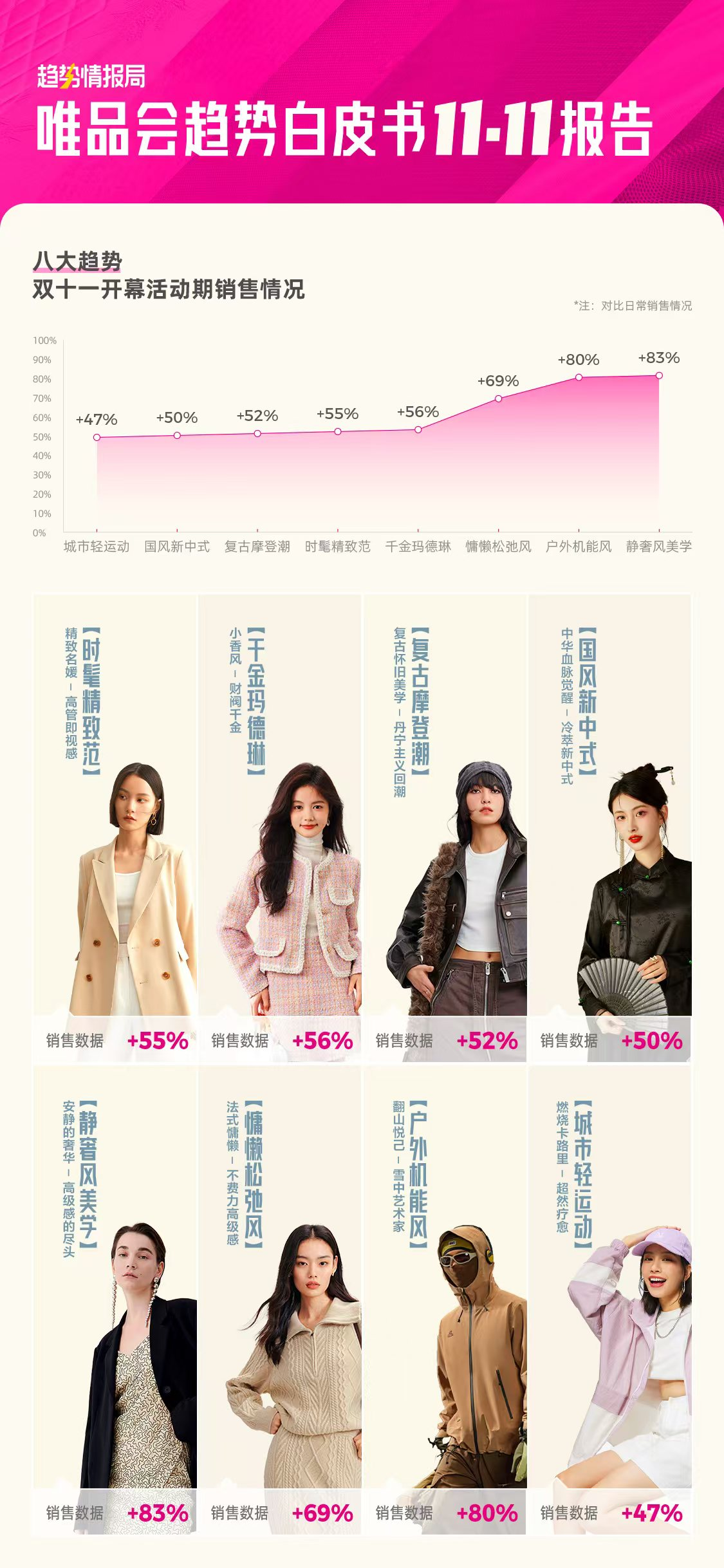 正值“雙十一”活動期間,唯品會在進博會上首次發佈《唯品會趨勢白皮書11.11報告》。報告顯示,城市輕運動、時髦精緻範、户外機能風等潮流趨勢熱度攀升,相關商品銷售快速增長。