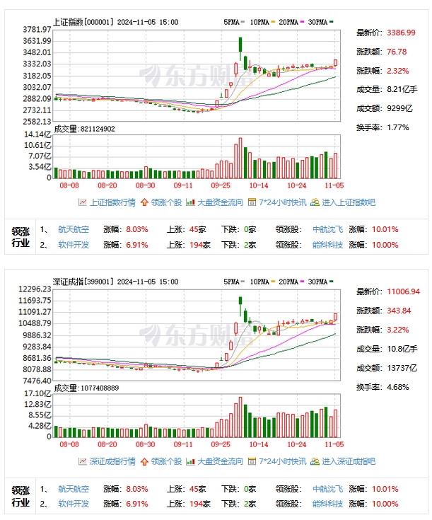 1月5日下午,A股收盤,三大指數集體大漲,上證指數收漲2.32%,收報3386.99點;深證成指收漲3.22%,自10月8日以來首次站上11000點整數關,創業板指收漲4.75%,收報2289.84點盤中一度觸及2300點大關;北證50指數大漲8.12%。全天成交額合計23506億元,較上一交易日放量6272億元。