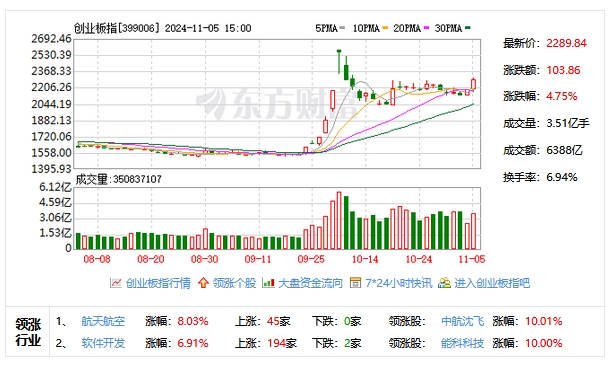 各行業板塊全面開花,航天航空、軟件開發、保險、非金屬材料、小金屬、半導體、電機、房地產服務、互聯網服務、電池、船舶製造、證券板塊漲幅居前。