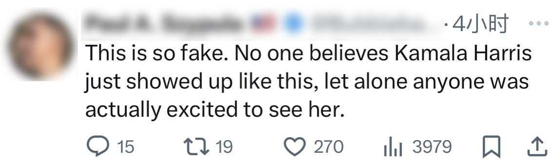“假的。沒人會相信哈里斯就這麼出現,更不用説有誰見到哈里斯會這麼興奮了。”