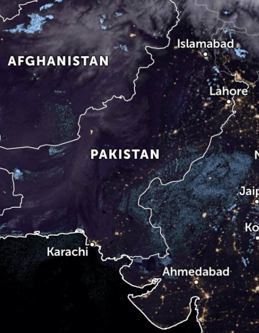 衞星圖像揭示了2023年大停電對巴基斯坦的影響:信德省、開伯爾-普什圖省、俾路支省和旁遮普省大部分地區一片漆黑,僅伊斯蘭堡和拉合爾部分地區有少許亮光