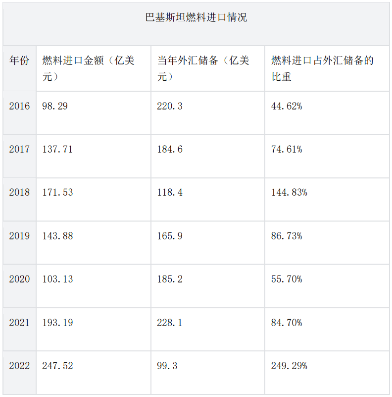 自 2016 年以來,巴基斯坦平均每年花費約 142.18 億美元從海外進口石油、天然氣等燃料。有些年份,能源進口的花費甚至超過了國家外匯儲備的總額。近幾年,俄烏衝突導致國際能源價格劇烈波動,進口能源的成本隨之飆升。這不僅讓巴基斯坦的外匯儲備捉襟見肘,也使得國內生產成本持續上漲。