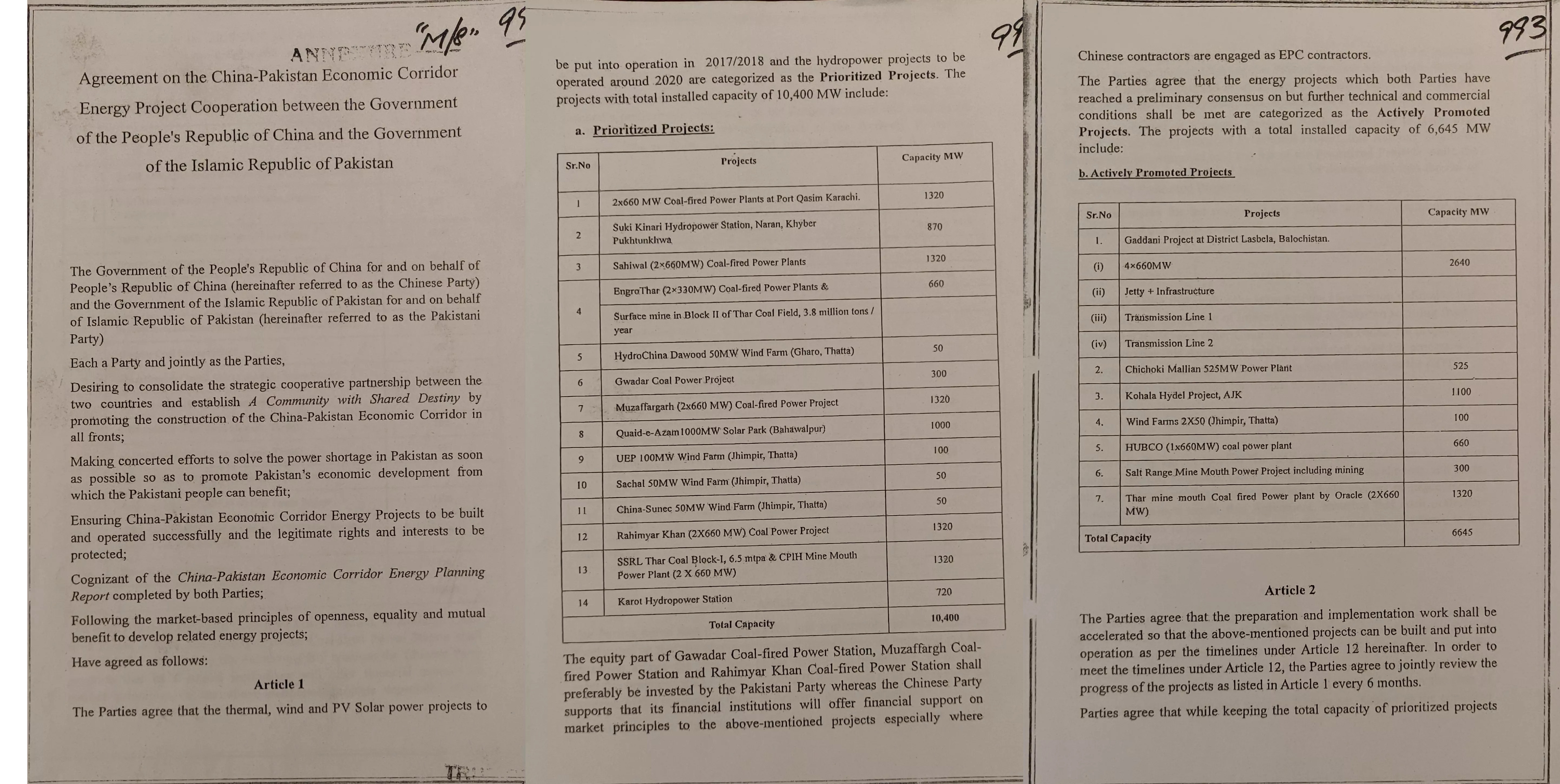 1.中華人民共和國政府和巴基斯坦伊斯蘭共和國政府. 關於中巴經濟走廊能源項目合作的協議. 2015.