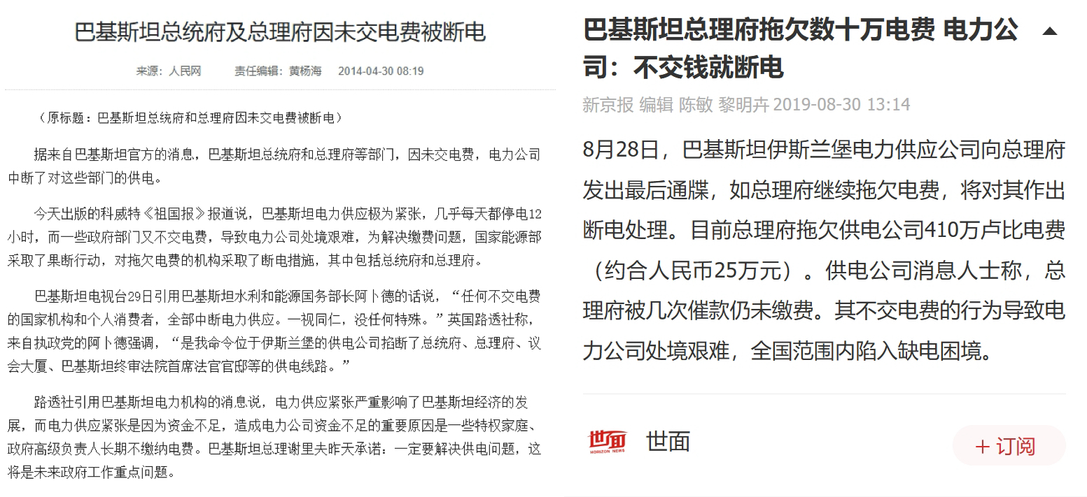 在用户端,高昂的電價以及電網公司維護不善,使得居民拖欠電費和偷電現象猖獗。亞洲開發銀行的報告顯示,2014 至 2015 財年,巴基斯坦電費的收繳率僅為89%,遠低於國家電力監管局設定的100%目標。不僅是普通居民,甚至連政府機構也存在拖欠電費的情況。2014 年和 2019 年,巴基斯坦的議會、總理府、總統府都曾因拖欠鉅額電費,被電網公司威脅斷電。