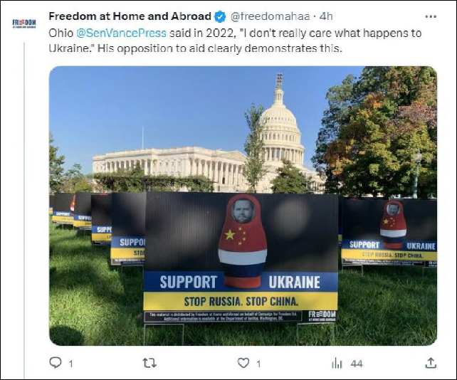根據該組織去年8月初發布的一份新聞稿,它在媒體宣傳上的支出達到六位數,包括在美國保守派主流媒體福克斯新聞台的週日節目中投放了30秒廣告。去年10月,該組織出資在華盛頓國會大廈外的草坪上樹起一系列標語,萬斯等人的頭像被安在俄羅斯套娃上,旁邊寫着:“支持烏克蘭,阻止俄羅斯,阻止中國。”
