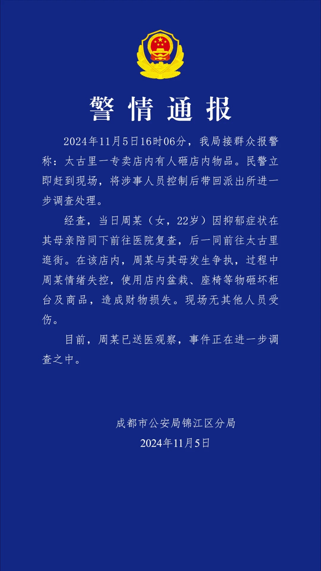 據微信公眾號“成都錦江公安”消息,成都市公安局錦江區分局5日晚發佈警情通報稱,涉事人員周某因抑鬱症狀前往醫院複查,返途與其母一同前往太古里逛街。周某與其母發生爭執,遂情緒失控,砸壞櫃枱及商品,造成財物損失。目前,涉事人員周某已送醫觀察。