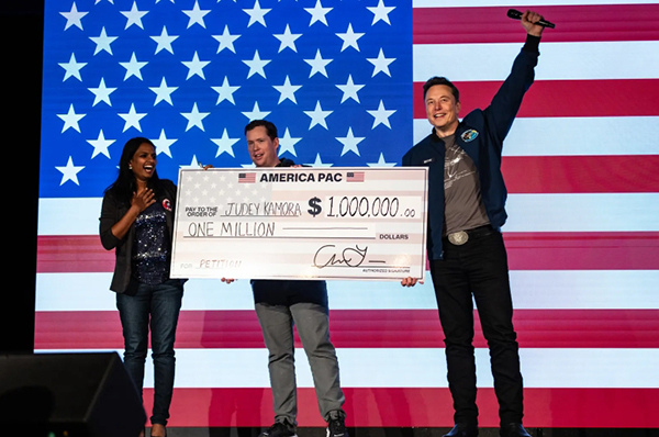 10月19日晚,馬斯克在賓夕法尼亞州出席支持特朗普的競選活動時宣佈,在11月5日美國總統選舉日之前,他創辦的“美國政治行動委員會”將每天隨機向一名簽署其請願書的七個搖擺州(賓夕法尼亞、亞利桑那、佐治亞、密歇根、內華達、北卡羅來納和威斯康星)選民贈送100萬美元。
